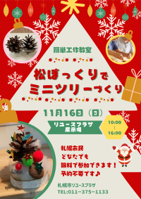 松ぼっくりを使って手のひらサイズの可愛いツリーを作りませんか?予約不要、無料です。お買い物ついでに、資源物のお持ち込みついでに作ってみませんか?