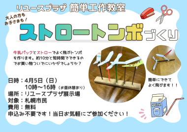 「ストロートンボづくり」を行います。予約不要、無料です。お買い物ついでに、資源物のお持ち込みついでに作ってみませんか?大人も子どもも大歓迎!