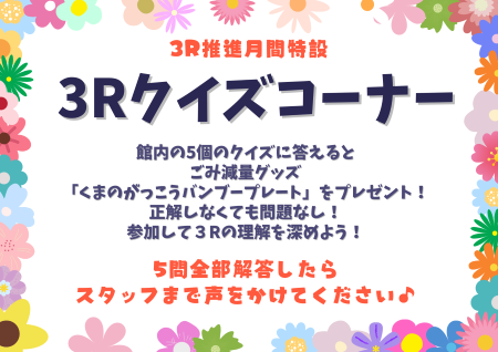 今月は3R(Reduce/Reuse/Recycle)について考えてみませんか?館内に3Rに関する5題のクイズを出題しています。全部解答した方にはごみ減量グッズとして「くまのがっこう」のバンブープレートをプレゼント♪間違っていても問題なし!解答を見せる必要もなし!ぜひお気軽にご参加くださいね♪